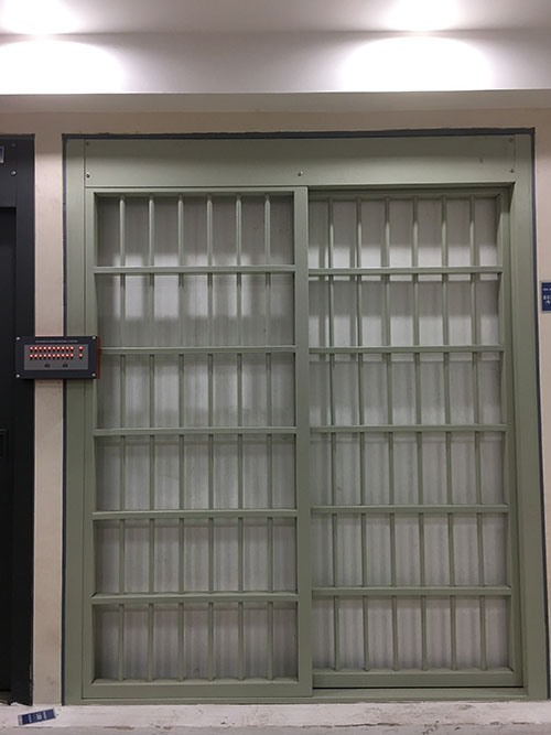 監(jiān)室門可向門洞兩側雙向開啟或左、右兩側單向開啟。監(jiān)室門主要由開門機組件、傳動件罩殼、傳動組件、導軌、行走輪、支架、導軌罩殼、門扇、控制箱、導向輪、密封組件等組成。導軌安裝于門洞上邊,門扇通過行走輪組件懸掛于導軌上,由開門機通過傳動組件帶動行走輪、門扇一起行走。傳動組件內(或導軌一側)設有限位開關,門開啟和關閉到位后,即自動停止。導軌、傳動組件、開門機上均設有罩殼防塵、防雨,門扇下方設有導向輪和擋鐵,以限制門扇前后擺動。如遇停電或電路故障,可用專用鑰匙將開門機中離合器分離,即可實現(xiàn)手動啟閉。監(jiān)室門不僅堅固可靠,而且有很好的耐久性,采用的原材料,精密的工藝及制造技術。外表采用先進的粉末噴涂表面處理工藝,不僅堅固可靠,而且有很好的耐久性?? 1、集中遠程控制,按照指令實現(xiàn)單獨開門或關門,以及總開、總關所有門扇;????2、總線制布線,工程施工十分簡潔,布線成本。???? 3、采用一體化動力梁設計,免維護結構,不但在安裝施工中非常方便,而且在日后需要移裝時亦可簡單拆分后再次安裝使用。???? 4、門扇運行時遇阻能電動退回,具有防夾人的安全功能,實現(xiàn)人性化管理。??????5、門扇遇阻退回后能電動執(zhí)行再關門動作,直到把門關閉;累計遇阻3次即電動報警,防止蓄意破壞。???? 6、開啟門扇時能聯(lián)動各門口攝像頭,同步監(jiān)視現(xiàn)場情況;???? 7、關門到位電動實現(xiàn)馬達鎖定功能,并可聯(lián)動另加電鎖,實現(xiàn)雙鎖定的多重安全保障。???? 8、可設定在火警信號下實現(xiàn)手動開、關門功能,符合火災等緊急情況疏散要求。