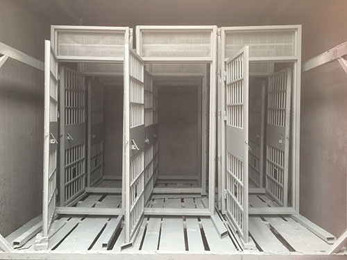 監(jiān)室門可向門洞兩側(cè)雙向開啟或左、右兩側(cè)單向開啟。監(jiān)室門主要由開門機(jī)組件、傳動(dòng)件罩殼、傳動(dòng)組件、導(dǎo)軌、行走輪、支架、導(dǎo)軌罩殼、門扇、控制箱、導(dǎo)向輪、密封組件等組成。導(dǎo)軌安裝于門洞上邊,門扇通過(guò)行走輪組件懸掛于導(dǎo)軌上,由開門機(jī)通過(guò)傳動(dòng)組件帶動(dòng)行走輪、門扇一起行走。傳動(dòng)組件內(nèi)(或?qū)к壱粋?cè))設(shè)有限位開關(guān),門開啟和關(guān)閉到位后,即自動(dòng)停止。導(dǎo)軌、傳動(dòng)組件、開門機(jī)上均設(shè)有罩殼防塵、防雨,門扇下方設(shè)有導(dǎo)向輪和擋鐵,以限制門扇前后擺動(dòng)。如遇停電或電路故障,可用專用鑰匙將開門機(jī)中離合器分離,即可實(shí)現(xiàn)手動(dòng)啟閉。監(jiān)室門不僅堅(jiān)固可靠,而且有很好的耐久性,采用的原材料,精密的工藝及制造技術(shù)。外表采用先進(jìn)的粉末噴涂表面處理工藝,不僅堅(jiān)固可靠,而且有很好的耐久性?? 1、集中遠(yuǎn)程控制,按照指令實(shí)現(xiàn)單獨(dú)開門或關(guān)門,以及總開、總關(guān)所有門扇;????2、總線制布線,工程施工十分簡(jiǎn)潔,布線成本。???? 3、采用一體化動(dòng)力梁設(shè)計(jì),免維護(hù)結(jié)構(gòu),不但在安裝施工中非常方便,而且在日后需要移裝時(shí)亦可簡(jiǎn)單拆分后再次安裝使用。???? 4、門扇運(yùn)行時(shí)遇阻能電動(dòng)退回,具有防夾人的安全功能,實(shí)現(xiàn)人性化管理。??????5、門扇遇阻退回后能電動(dòng)執(zhí)行再關(guān)門動(dòng)作,直到把門關(guān)閉;累計(jì)遇阻3次即電動(dòng)報(bào)警,防止蓄意破壞。???? 6、開啟門扇時(shí)能聯(lián)動(dòng)各門口攝像頭,同步監(jiān)視現(xiàn)場(chǎng)情況;???? 7、關(guān)門到位電動(dòng)實(shí)現(xiàn)馬達(dá)鎖定功能,并可聯(lián)動(dòng)另加電鎖,實(shí)現(xiàn)雙鎖定的多重安全保障。???? 8、可設(shè)定在火警信號(hào)下實(shí)現(xiàn)手動(dòng)開、關(guān)門功能,符合火災(zāi)等緊急情況疏散要求。