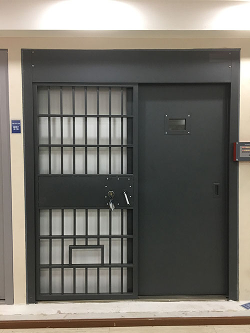 監(jiān)室門可向門洞兩側(cè)雙向開啟或左、右兩側(cè)單向開啟。監(jiān)室門主要由開門機組件、傳動件罩殼、傳動組件、導(dǎo)軌、行走輪、支架、導(dǎo)軌罩殼、門扇、控制箱、導(dǎo)向輪、密封組件等組成。導(dǎo)軌安裝于門洞上邊,門扇通過行走輪組件懸掛于導(dǎo)軌上,由開門機通過傳動組件帶動行走輪、門扇一起行走。傳動組件內(nèi)(或?qū)к壱粋?cè))設(shè)有限位開關(guān),門開啟和關(guān)閉到位后,即自動停止。導(dǎo)軌、傳動組件、開門機上均設(shè)有罩殼防塵、防雨,門扇下方設(shè)有導(dǎo)向輪和擋鐵,以限制門扇前后擺動。如遇停電或電路故障,可用專用鑰匙將開門機中離合器分離,即可實現(xiàn)手動啟閉。監(jiān)室門不僅堅固可靠,而且有很好的耐久性,采用的原材料,精密的工藝及制造技術(shù)。外表采用先進的粉末噴涂表面處理工藝,不僅堅固可靠,而且有很好的耐久性?? 1、集中遠程控制,按照指令實現(xiàn)單獨開門或關(guān)門,以及總開、總關(guān)所有門扇;????2、總線制布線,工程施工十分簡潔,布線成本。???? 3、采用一體化動力梁設(shè)計,免維護結(jié)構(gòu),不但在安裝施工中非常方便,而且在日后需要移裝時亦可簡單拆分后再次安裝使用。???? 4、門扇運行時遇阻能電動退回,具有防夾人的安全功能,實現(xiàn)人性化管理。??????5、門扇遇阻退回后能電動執(zhí)行再關(guān)門動作,直到把門關(guān)閉;累計遇阻3次即電動報警,防止蓄意破壞。???? 6、開啟門扇時能聯(lián)動各門口攝像頭,同步監(jiān)視現(xiàn)場情況;???? 7、關(guān)門到位電動實現(xiàn)馬達鎖定功能,并可聯(lián)動另加電鎖,實現(xiàn)雙鎖定的多重安全保障。???? 8、可設(shè)定在火警信號下實現(xiàn)手動開、關(guān)門功能,符合火災(zāi)等緊急情況疏散要求。