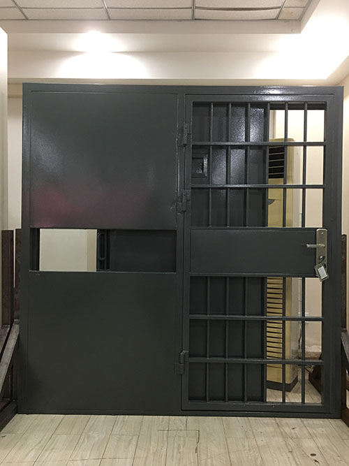 監室門可向門洞兩側雙向開啟或左、右兩側單向開啟。監室門主要由開門機組件、傳動件罩殼、傳動組件、導軌、行走輪、支架、導軌罩殼、門扇、控制箱、導向輪、密封組件等組成。導軌安裝于門洞上邊,門扇通過行走輪組件懸掛于導軌上,由開門機通過傳動組件帶動行走輪、門扇一起行走。傳動組件內(或導軌一側)設有限位開關,門開啟和關閉到位后,即自動停止。導軌、傳動組件、開門機上均設有罩殼防塵、防雨,門扇下方設有導向輪和擋鐵,以限制門扇前后擺動。如遇停電或電路故障,可用專用鑰匙將開門機中離合器分離,即可實現手動啟閉。監室門不僅堅固可靠,而且有很好的耐久性,采用的原材料,精密的工藝及制造技術。外表采用先進的粉末噴涂表面處理工藝,不僅堅固可靠,而且有很好的耐久性?? 1、集中遠程控制,按照指令實現單獨開門或關門,以及總開、總關所有門扇;????2、總線制布線,工程施工十分簡潔,布線成本。???? 3、采用一體化動力梁設計,免維護結構,不但在安裝施工中非常方便,而且在日后需要移裝時亦可簡單拆分后再次安裝使用。???? 4、門扇運行時遇阻能電動退回,具有防夾人的安全功能,實現人性化管理。??????5、門扇遇阻退回后能電動執行再關門動作,直到把門關閉;累計遇阻3次即電動報警,防止蓄意破壞。???? 6、開啟門扇時能聯動各門口攝像頭,同步監視現場情況;???? 7、關門到位電動實現馬達鎖定功能,并可聯動另加電鎖,實現雙鎖定的多重安全保障。???? 8、可設定在火警信號下實現手動開、關門功能,符合火災等緊急情況疏散要求。