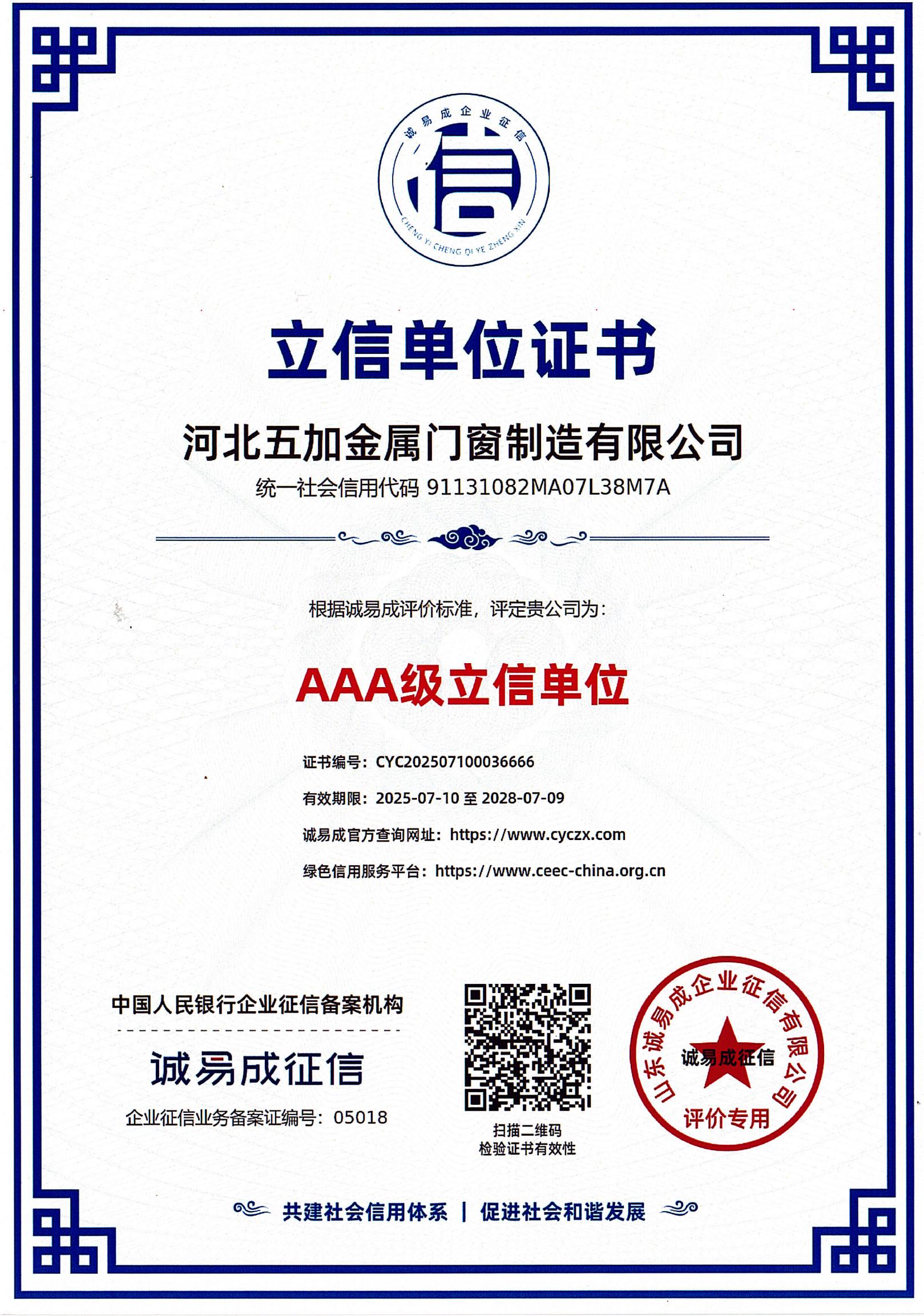 AAA級立信單位證書